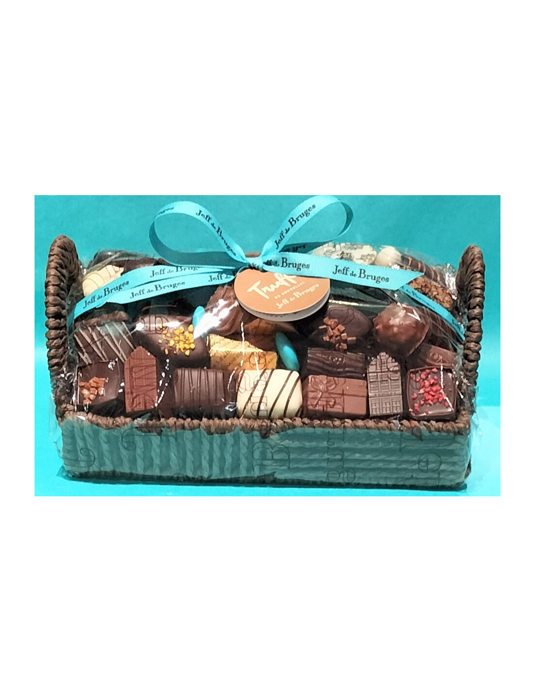 Decorativa cesta de mimbre rellena de nuestros exquisitos bombones belgas .Pralines,ganaches,cremas frescas,trufados.Un regalo que hará las delicias de todo el mundo