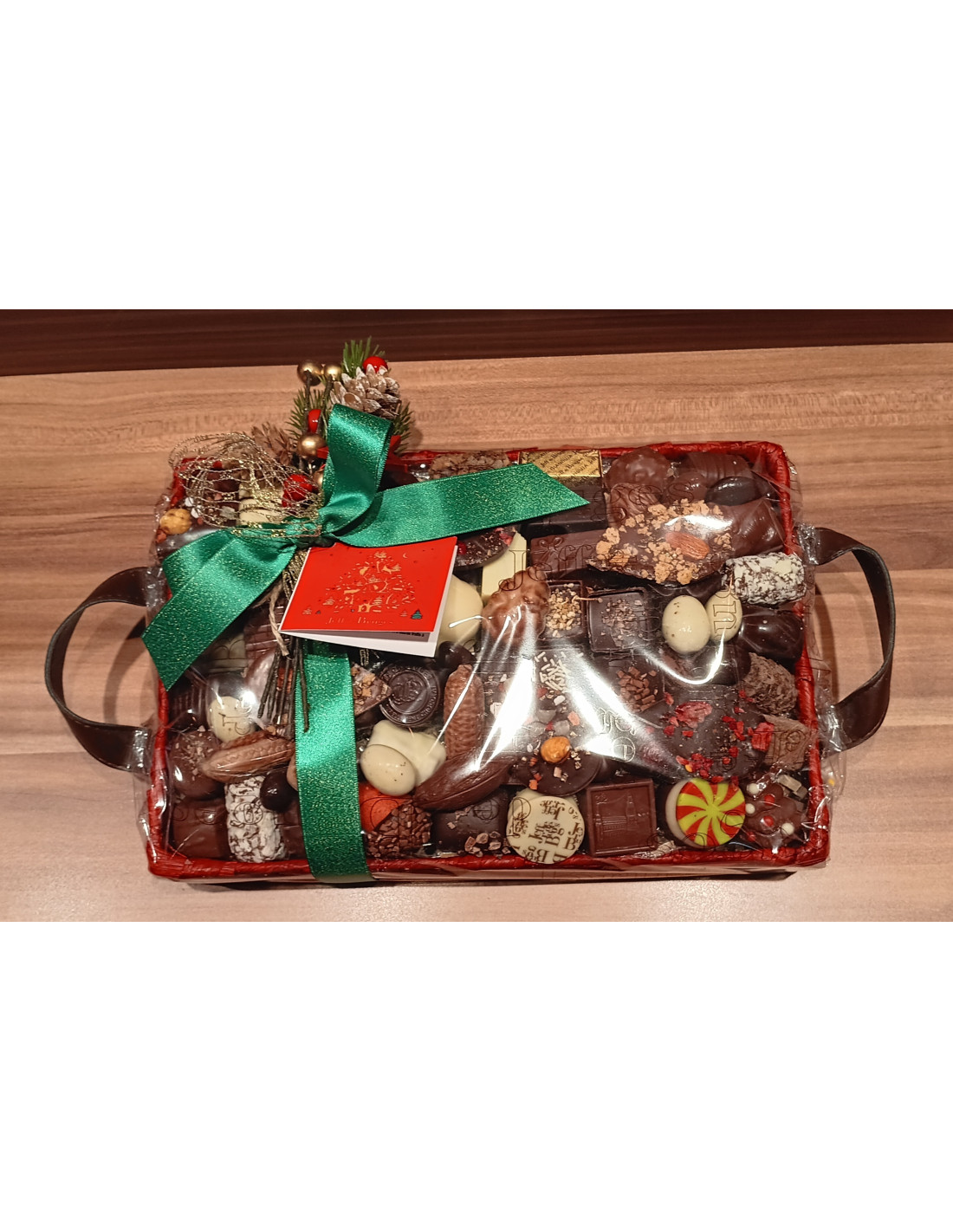 Decorativa cesta rectangular Navideña rellena con una variedad de nuestros exquisitos bombones belgas.Un regalo que hará las delicias de el gourmet .más exigente en estas fechas.Disponible en cuatro colores: