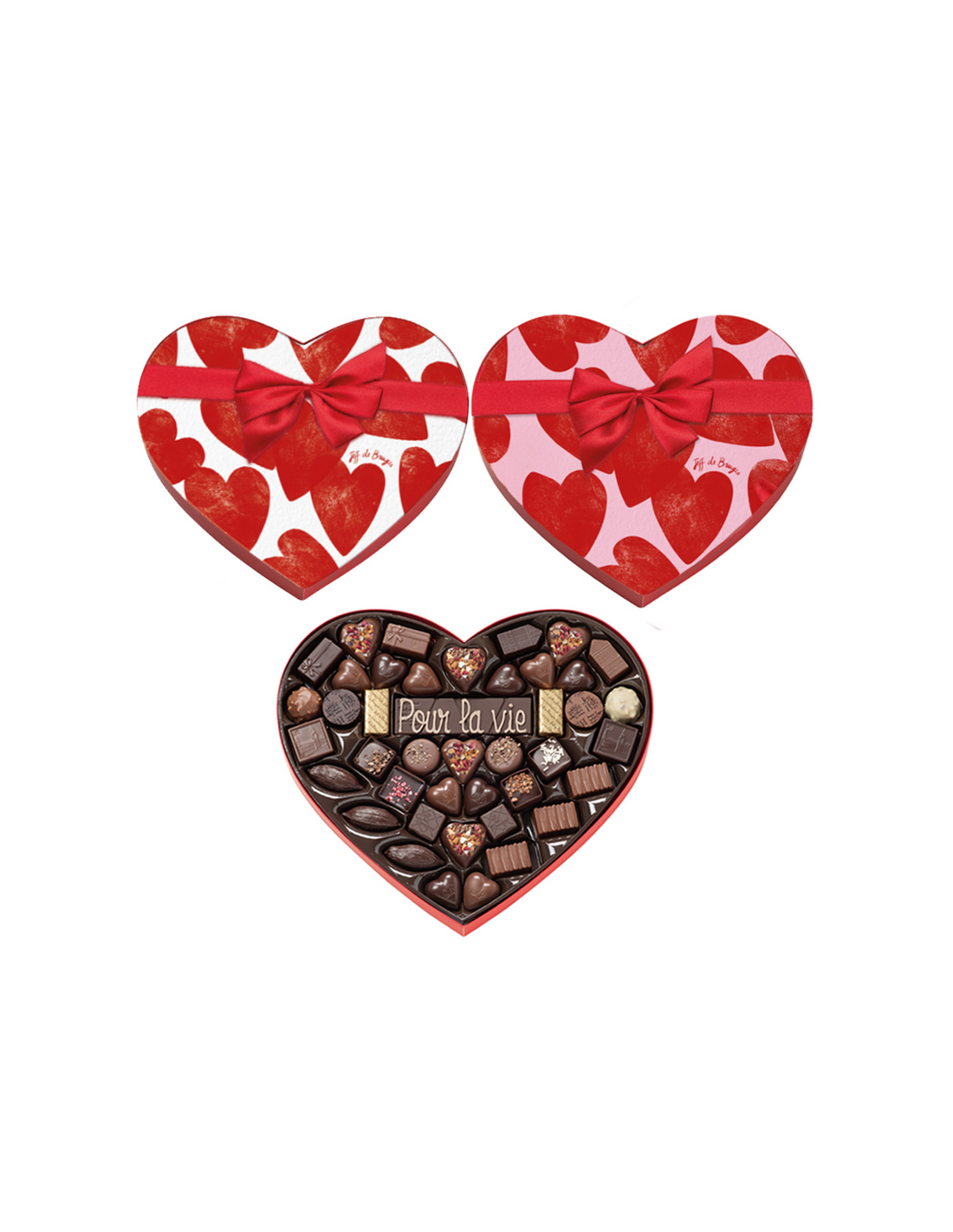 Caja con forma de corazón rellena con 450 gramos de bombones belgas. Diponible en dos colores: rojo o blanco.
