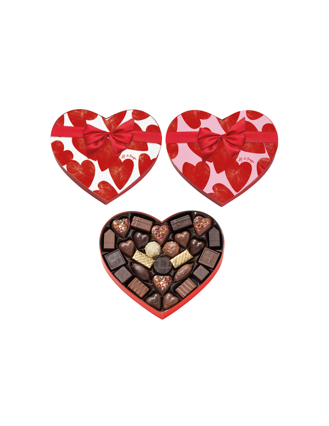 Caja con forma de corazón rellena con 275 gramos de bombones belgas. Disponible en dos colores: rojo o blanco