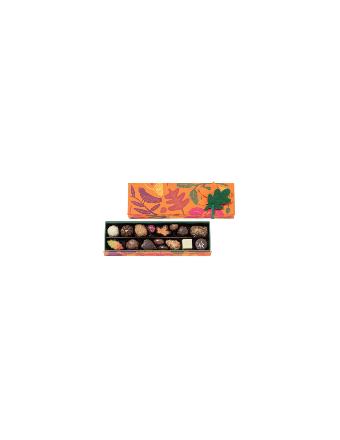 Atractiva caja de colores otoñales rellena con 190 grms de bombones belgas variados.Un exquisito surtido de pralines,ganaches,frutos de otoño,almendras chocolateadas........Un regalo que hará las delicias del paladar más exigente