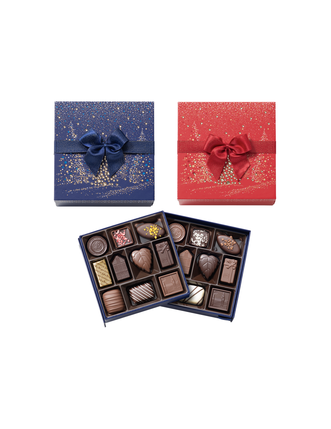 Decorativa caja navideña rellena con una exquisita variedad de bombones belgas dispuestos en dosbandejas deslizables.Disponible en dos colores.Rojo y azul cobalto.