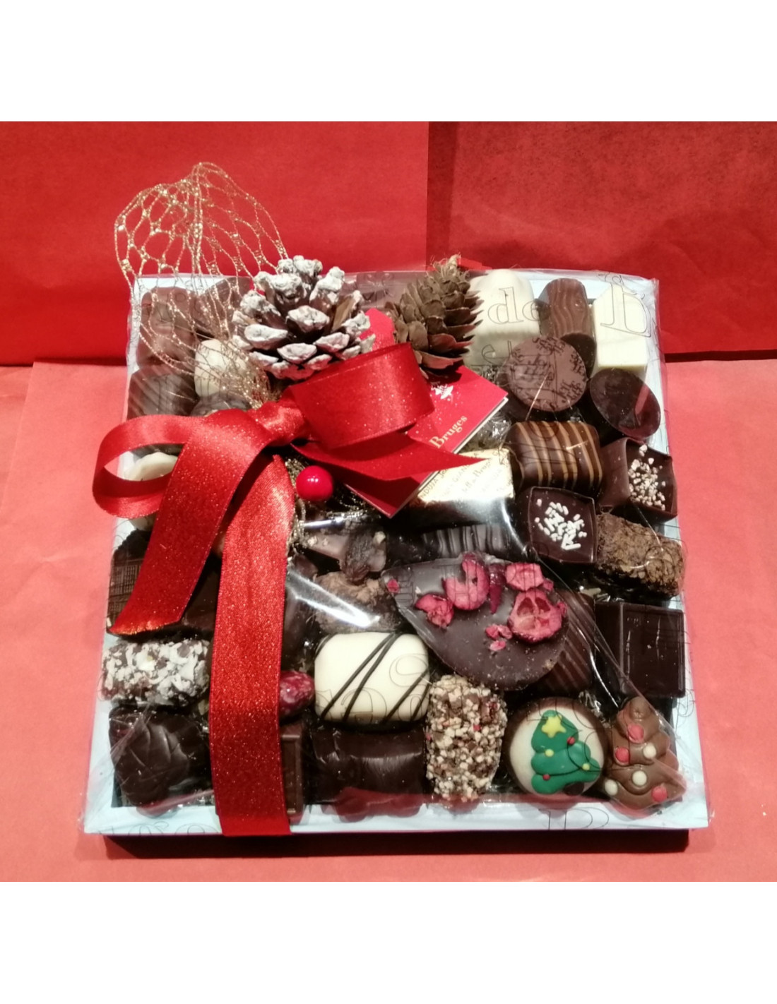 Atractiva bandeja de madera decorada con motivos navideños y rellena con una selección de nuestros exquisitos bombones belgas.Un dulce regalo para hacer las delicias de el paladar más exigente.Disponible en dos colores: Rojo y verde.