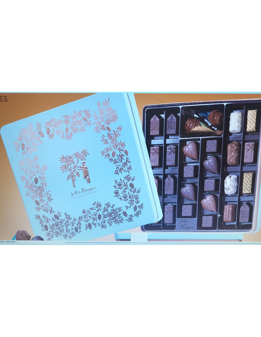 Decorativa caja navideña de metal,rellena con una variedad de nuestros exquisitos bombones belgas.Pralines,ganaches,cremas frescas,trufados....Una delicia en atractiva presentación.Un regalo navideño para los más golosos