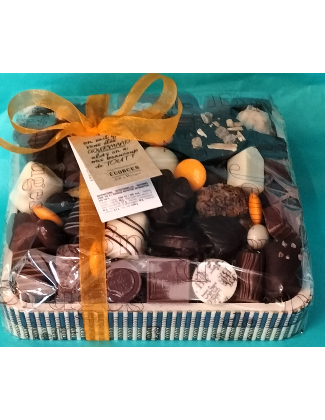 Exclusiva cesta con base de madera,rellena con una variedad de nuestros exquisitos bombones belgas frescos.Pralines,Ganaches,Cremas frescas,trufados........ Un dulce regalo con atractiva presentación.