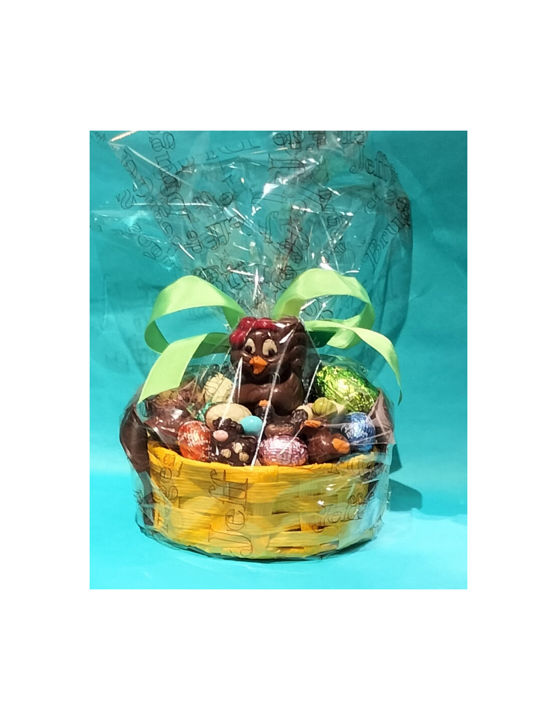 Cesta con figuras y huevos de chocolate belga